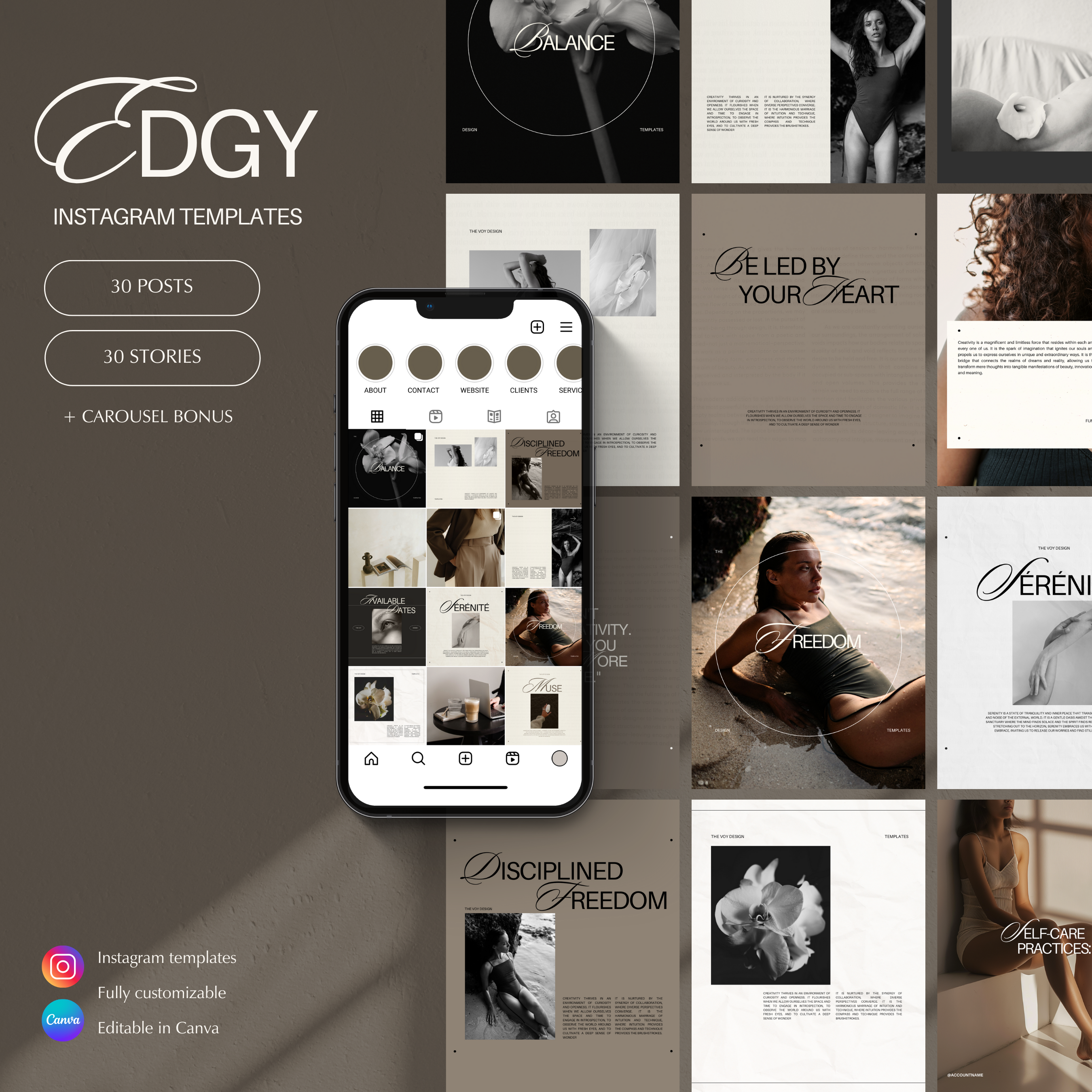 Introducing a new collection of aesthetic, minimalist, edgy Instagram templates designed to elevate your social media presence. Crafted with simplicity and elegance in mind, these templates are not only visually appealing but also incredibly easy to use in Canva.
